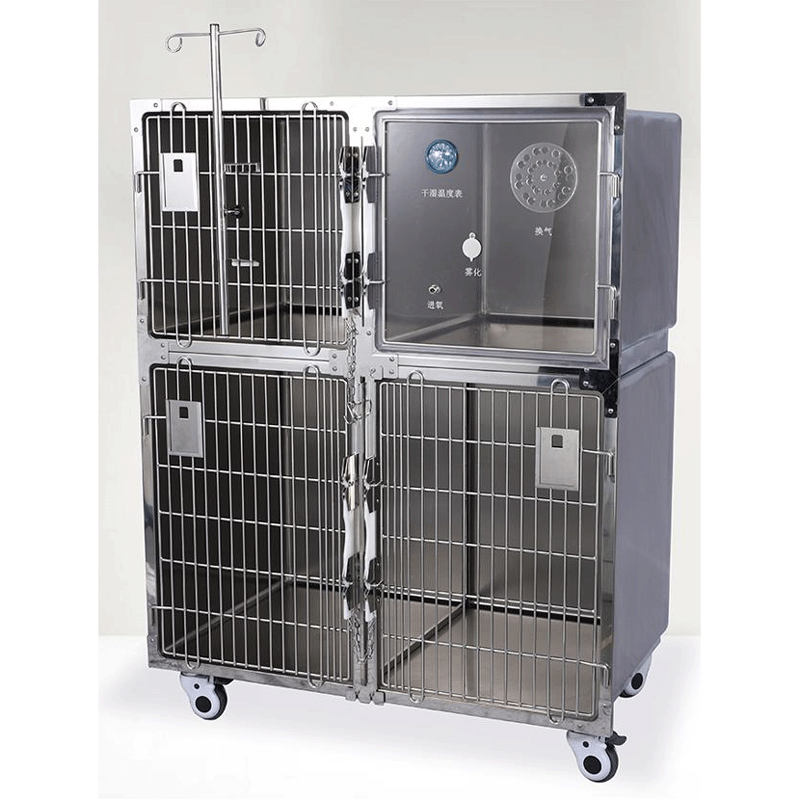 Klatka ze stali nierdzewnej 4 wnęki 122x70x157 cm to trwała i funkcjonalna klatka weterynaryjna wykonana ze stali nierdzewnej 304. Wyposażona w automatyczny zamek przesuwny, ciche kółka z hamulcem, właz i port tlenowy oraz wyświetlacz temperatury suchej i mokrej, zapewnia wygodę użytkowania, bezpieczeństwo i łatwość utrzymania czystości.