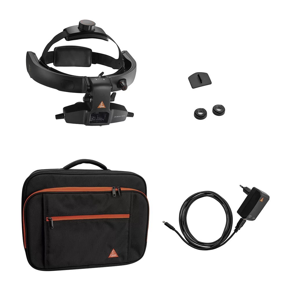 Zestaw zawiera: Oftalmoskop pośredni HEINE OMEGA 600, (z baterią i okularem +2 D), E4-USBC, okular 0 D*, torba transportowa.
