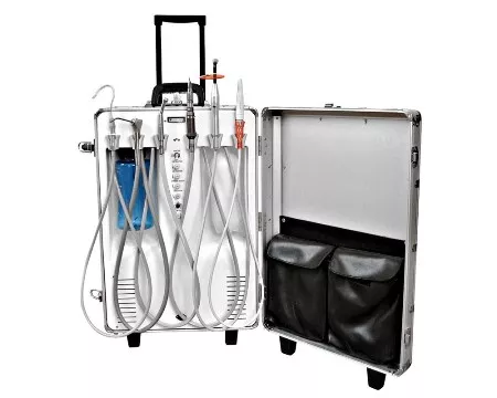 Dzięki wytrzymałej aluminiowej obudowie walizka wygląda jak standardowy bagaż podróżny i waży zaledwie 30 kg, co ułatwia jej transport. Teraz możesz zabrać cały gabinet stomatologiczny ze sobą – gdziekolwiek jesteś potrzebny!