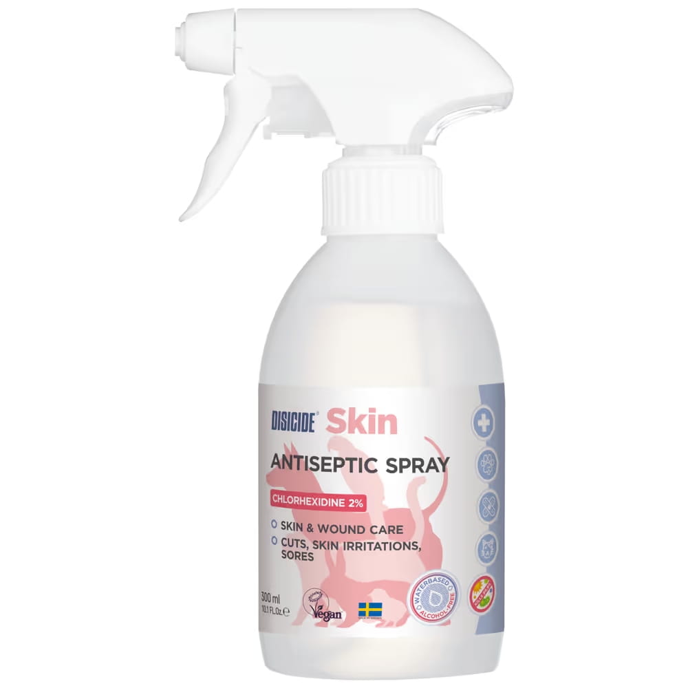 Disicide Skin Chlorhexidine 2% Spray to delikatny, a jednocześnie skuteczny środek do dezynfekcji skóry zwierząt. Dzięki zawartości 2% chlorheksydyny działa antyseptycznie, chroniąc przed rozwojem bakterii i grzybów. Może być stosowany na rany, zadrapania, ukąszenia oraz podrażnienia skórne, wspomagając proces gojenia i zapobiegając infekcjom.