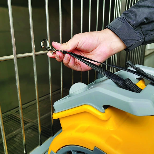 Kompaktowa suszarka do bezobsługowego suszenia w klatce – idealna po kąpieli lub zabiegach pielęgnacyjnych. Montowana bezpośrednio do drzwi klatki na dołączonych hakach; mały gabaryt ułatwia ustawienie w gabinecie/groomingu.