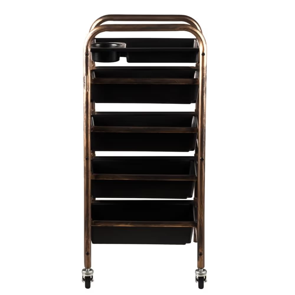 Wózek wyposażony jest w cztery pojemne, wysuwane kuwety oraz górną tackę, na której można przechowywać często używane kosmetyki. Dodatkowym atutem jest spiralny, metalowy uchwyt na suszarkę, umieszczony z boku wózka. Swobodny dostęp do kuwet z obu stron sprawia, że wszystkie narzędzia są zawsze w zasięgu ręki.