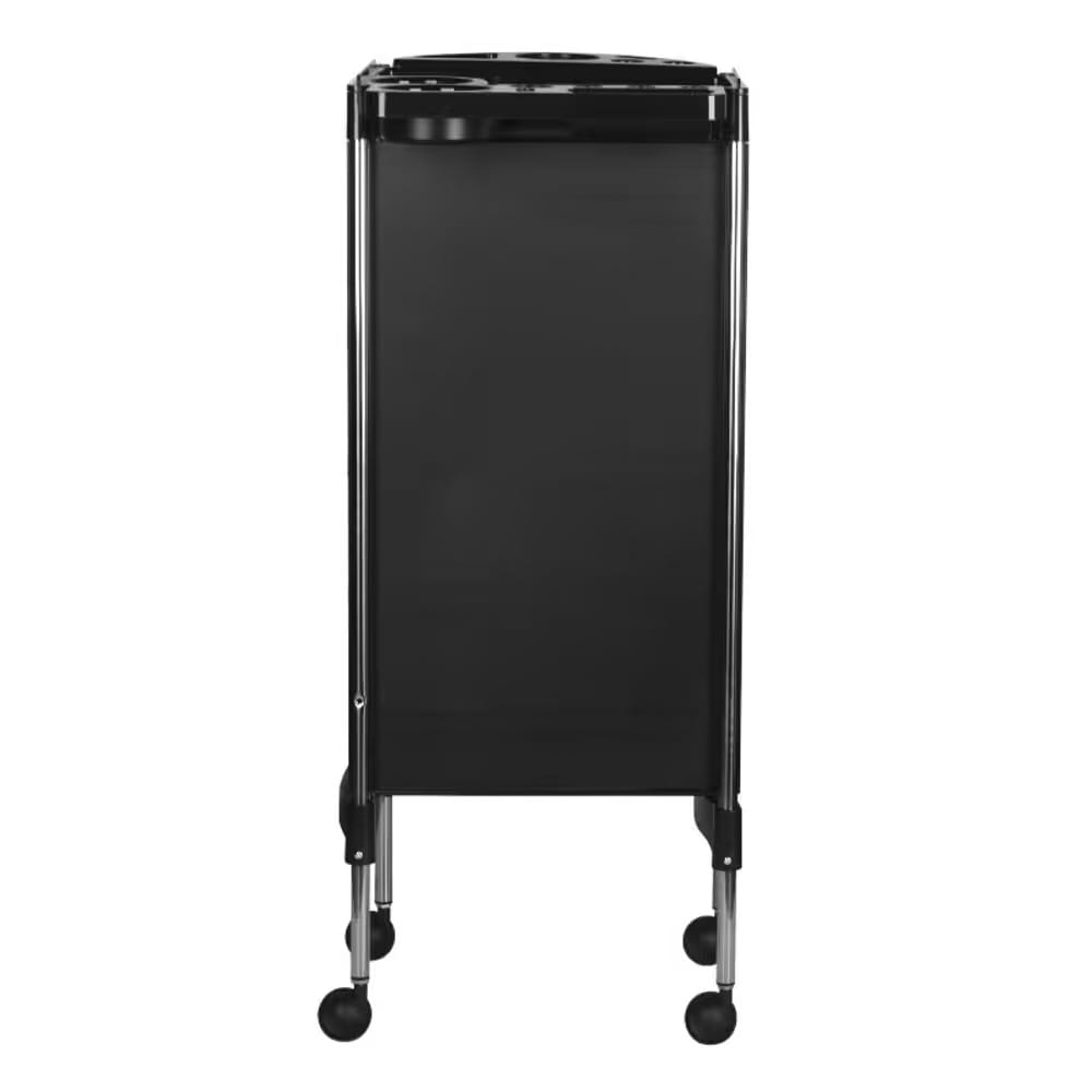 Wózek oferuje swobodny dostęp do kuwet z obu stron, co ułatwia korzystanie z narzędzi w trakcie pracy. Górna tacka pozwala na wygodne przechowywanie kosmetyków i drobnych akcesoriów, a boczne uchwyty pomagają w organizacji sprzętu elektrycznego.